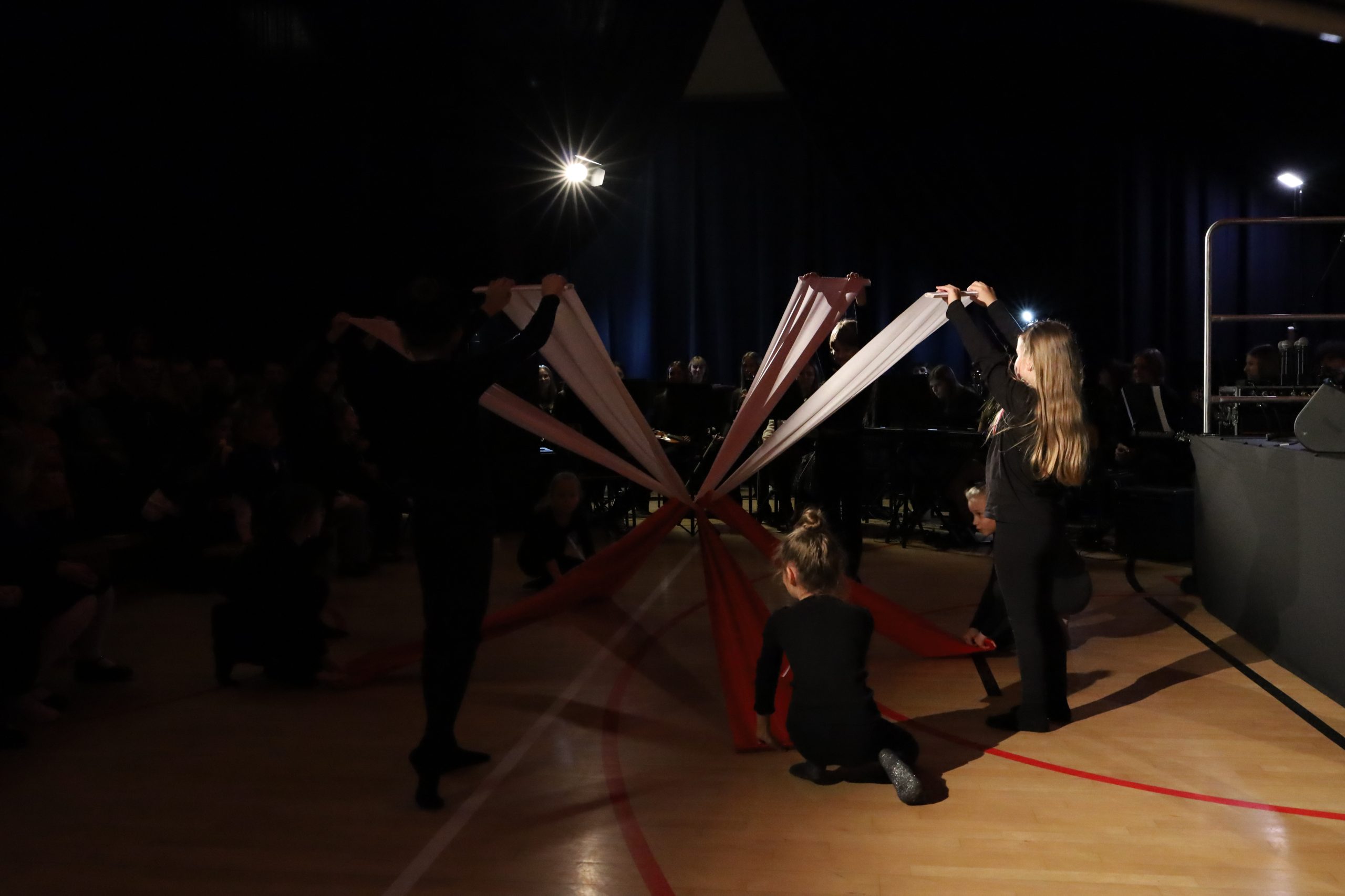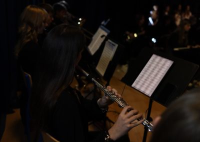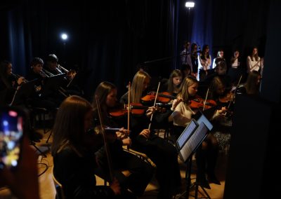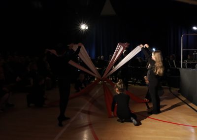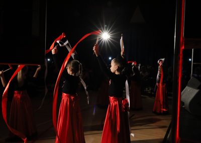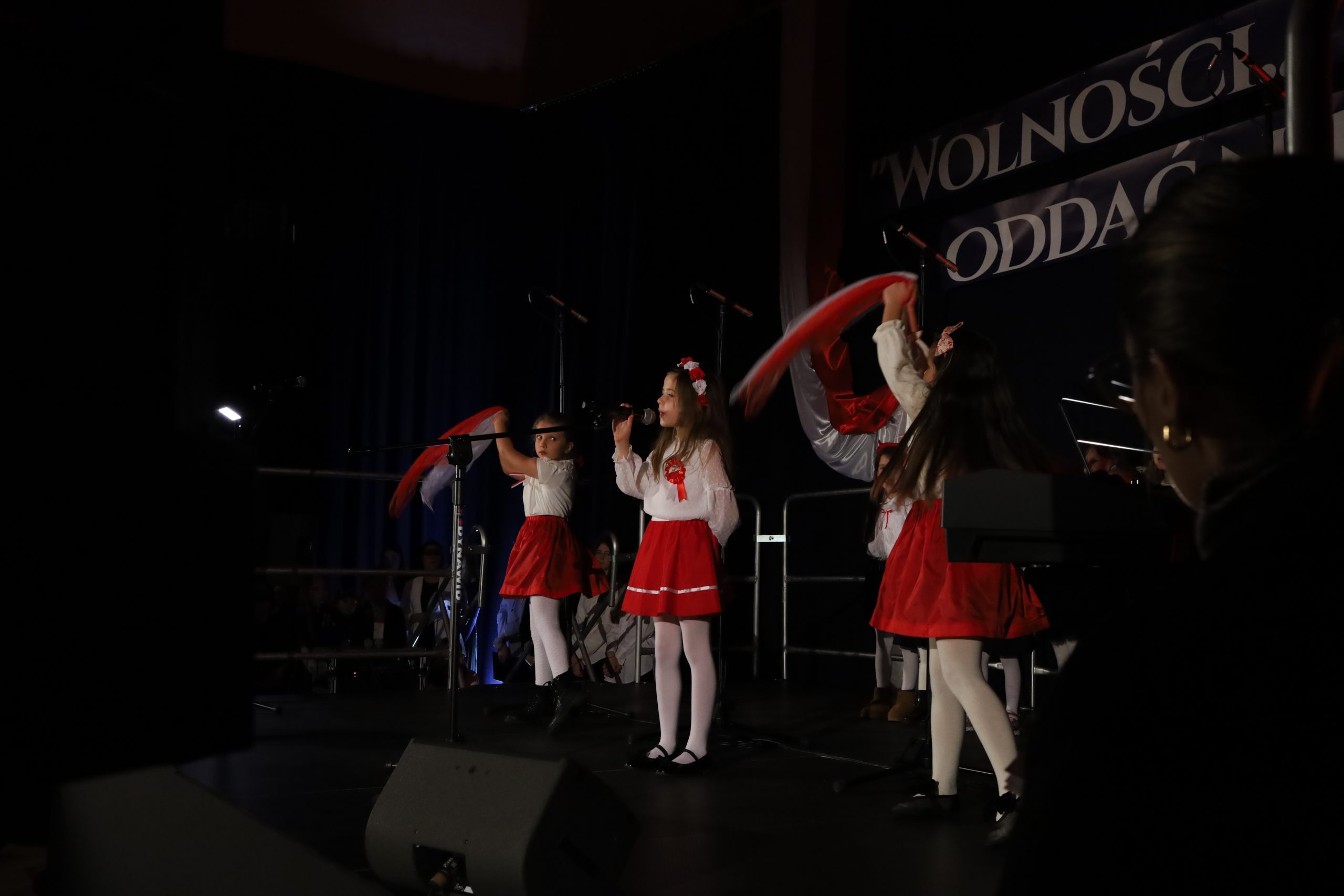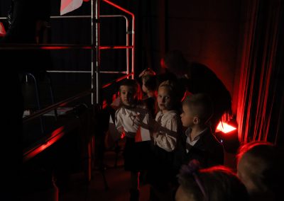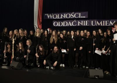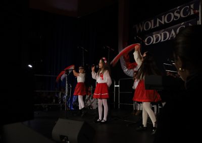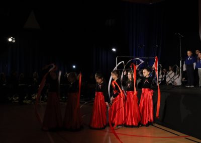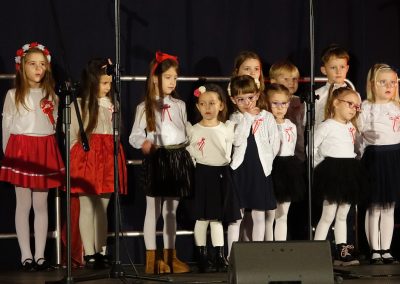 Jak zwykle nie zabrakło występów – najmłodszych, przedszkolaków z naszego przedszkola Carissimus, uczniów klas 1-3, szkoły podstawowej i liceum. W ramach niespodzianki z piosenką Edyty Geppert „Nie żałuję” wystąpiły też członkinie kadry JCE. Program był bardzo zróżnicowany – obok poważnych wierszy i pełnych symbolizmu pieśni wykonywanych przez zespół Jezuski wraz z solistkami – uczennicą klasy 8 A, Marysią Kołodziejczyk, Karoliną Jasińską z klasy 1AL, czy Mają Wróbel z klasy 1AL, były śpiewane dziecięcymi głosami proste piosenki o miłości do ojczyzny. Były tańce – z flagami, czy układ z biało – czerwonymi wstążkami, a także wiele ważnych informacji z historii odzyskania przez Polskę niepodległości, które przedstawili nam Klara Kogut z kl. 1CL oraz Franciszek Gwiżdż – Fortuna z kl. 8 B – nasi niezrównani konferansjerzy. Na koniec naszego spotkania wszyscy razem odśpiewaliśmy uroczyste „Te Deum”.